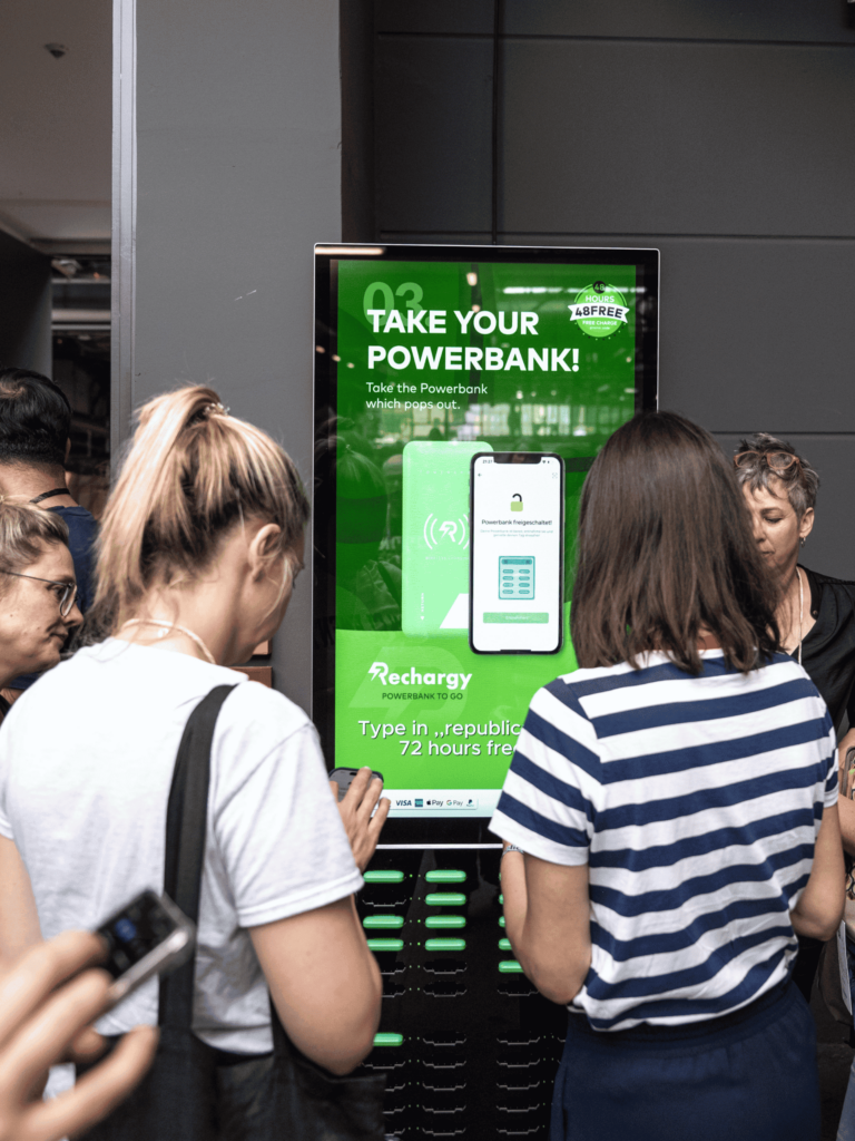 Your branded charging station with image video incl. power banks to borrow during the event with your logo.